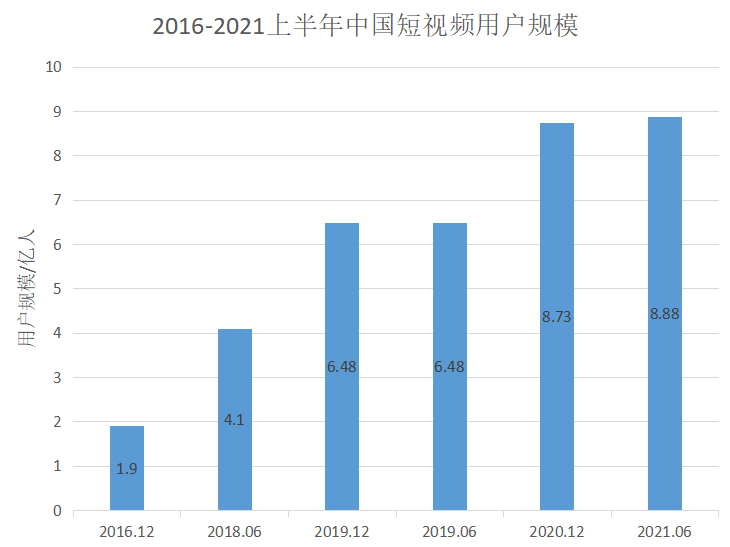 根據(jù)上圖顯示,從2016年12月至2021年6月,短視頻用戶規(guī)模急速上漲,截止至2021年6月短視頻用戶的使用率占全網(wǎng)的87.8%,由此可見,短視頻成為“時間黑洞”搶占用戶的時間,深刻影響著人們的生產(chǎn)生活。