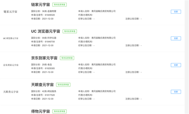 市場(chǎng)上靠搶注商標(biāo)以維權(quán)或轉(zhuǎn)讓獲利的企業(yè)不少,記者在天眼查搜索發(fā)現(xiàn),一家名為“青岡縣鞠氏商貿(mào)有限公司”申請(qǐng)了約1500個(gè)元宇宙相關(guān)商標(biāo),幾乎包攬了各大知名品牌,包括“沃爾瑪元宇宙”“鏈家元宇宙”“京東到家元宇宙”等。